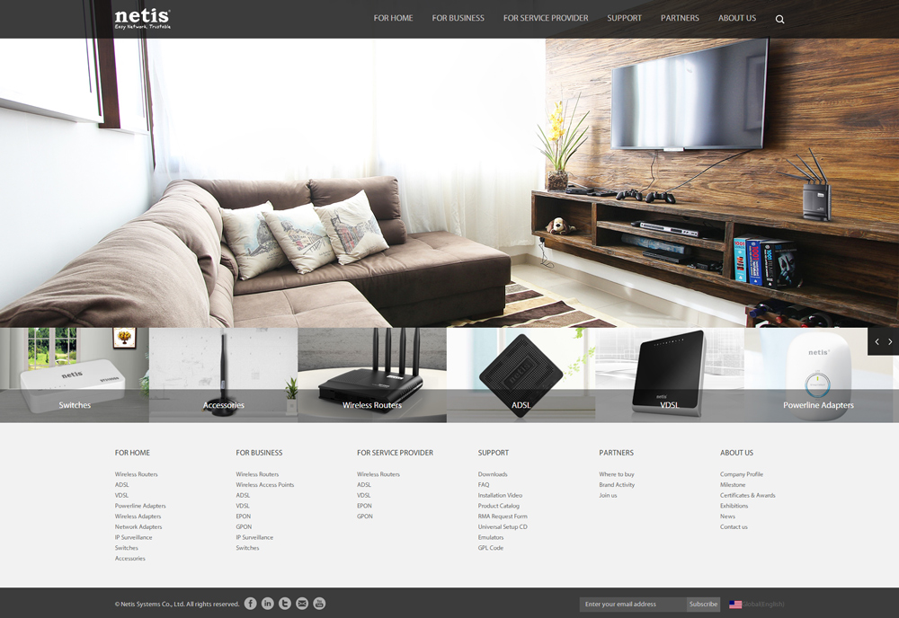 The NETIS SYSTEMS’ product family includes wireless routers, wireless adapters, switches, DSL modems &routers, network adapters, EPON, GPON, etc.,and is evolving into products that related to storage, security, multimedia and other technologies.