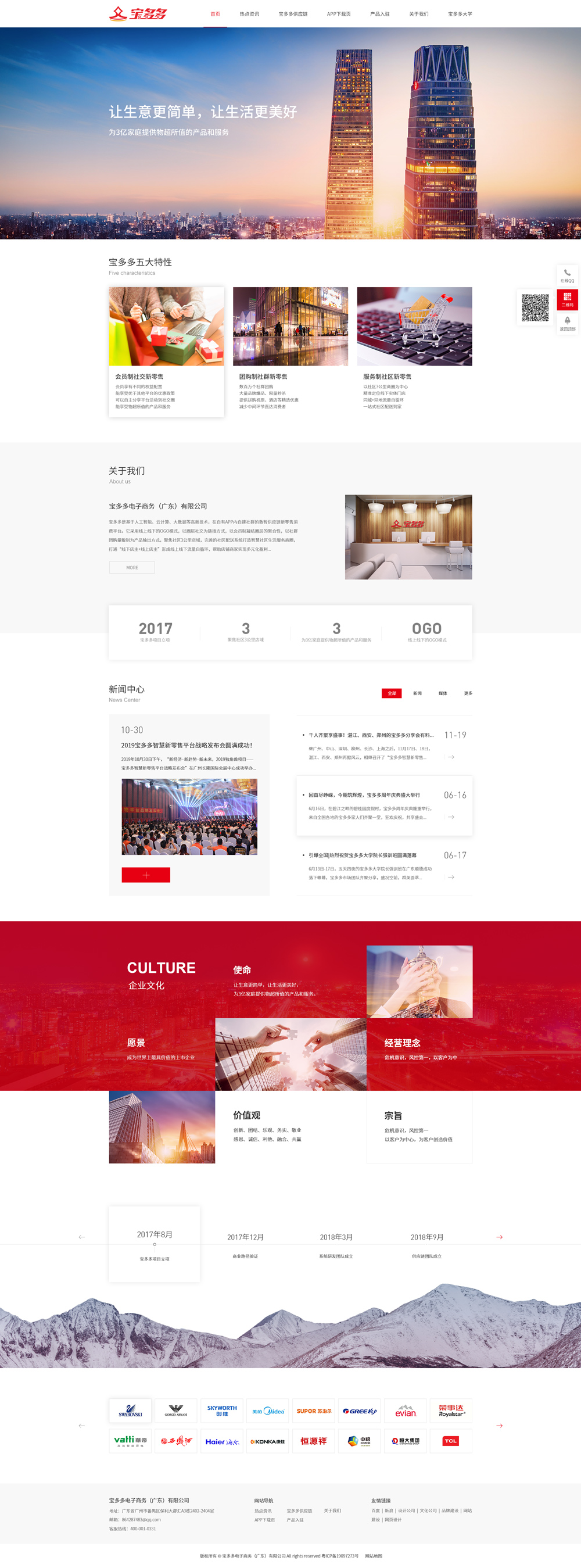 寶多多平臺以“人”為本,秉承創新、團結、樂觀、務實、敬業、感恩、誠信、利他、融合、共贏的核心價值觀,重塑業態結構與生態商圈,形成九大生態體系閉環。切實解決廠家銷量、商家客流量、會員消費實惠等問題,為3億家庭提供物超所值的產品和服務。