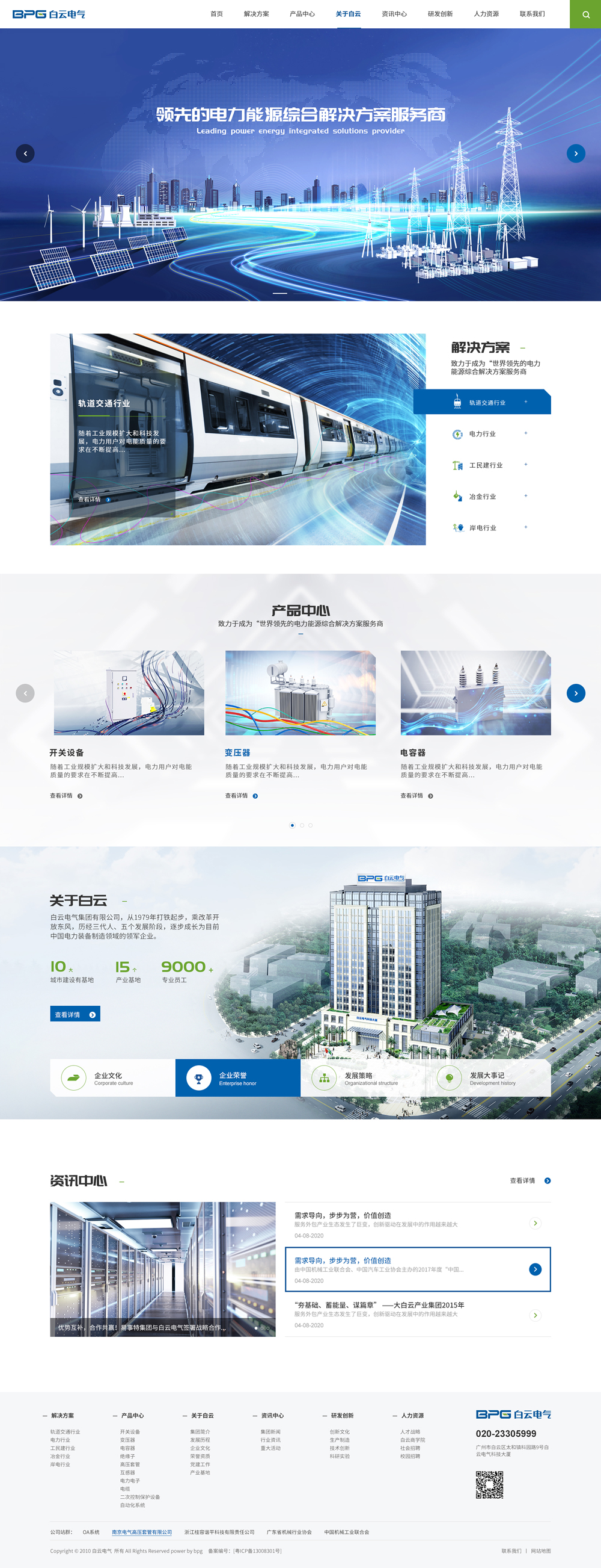 白云電氣于1988年開(kāi)始專(zhuān)注于電力裝備制造領(lǐng)域,緊緊以“百年的白云、世界的白云”的愿景為牽引,以民族電力裝備振興為己任,三代人專(zhuān)心專(zhuān)注于電力能源領(lǐng)域毫不動(dòng)搖,不斷完善產(chǎn)品鏈,逐步發(fā)展成為以廣州為總部,在廣州、南京、桂林、杭州、濟(jì)南、南昌等10個(gè)地區(qū)建有15個(gè)產(chǎn)業(yè)基地的跨區(qū)域產(chǎn)業(yè)集團(tuán),員工總數(shù)一萬(wàn)余人,集團(tuán)及旗下企業(yè)產(chǎn)品和服務(wù)涵蓋了發(fā)電、輸電、變電、配電、用電、電能質(zhì)量治理、自動(dòng)化控制、數(shù)字運(yùn)營(yíng)服務(wù),電壓等級(jí)覆蓋0.4kV-1100kV,是國(guó)內(nèi)同行業(yè)產(chǎn)品鏈最全的企業(yè)之一,并成為國(guó)家電網(wǎng)、南方電網(wǎng)、城市軌道交通、核電及多家行業(yè)知名企業(yè)、重大工程項(xiàng)目的核心電力裝備及控制系統(tǒng)供應(yīng)商。