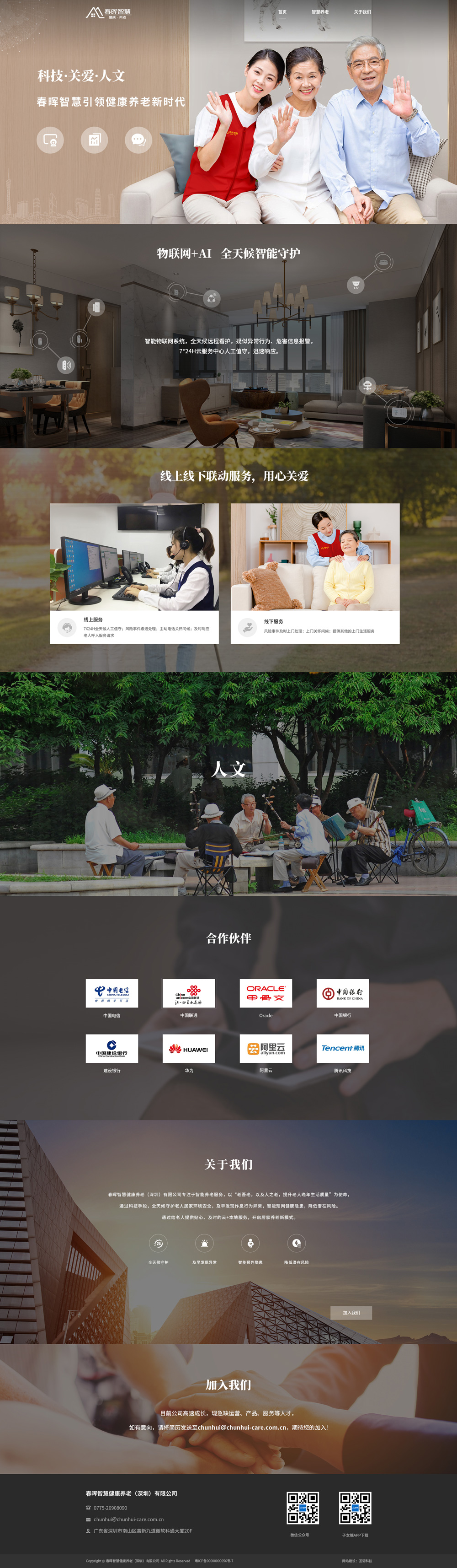 春暉智慧健康養老(深圳)有限公司專注于智能養老服務,以“老吾老,以及人之老,提升老人晚年生活質量”為使命, 通過科技手段,全天候守護老人居家環境安全,及早發現作息行為異常,智能預判健康隱患,降低潛在風險。 通過給老人提供貼心、及時的云+本地服務,開啟居家養老新模式。