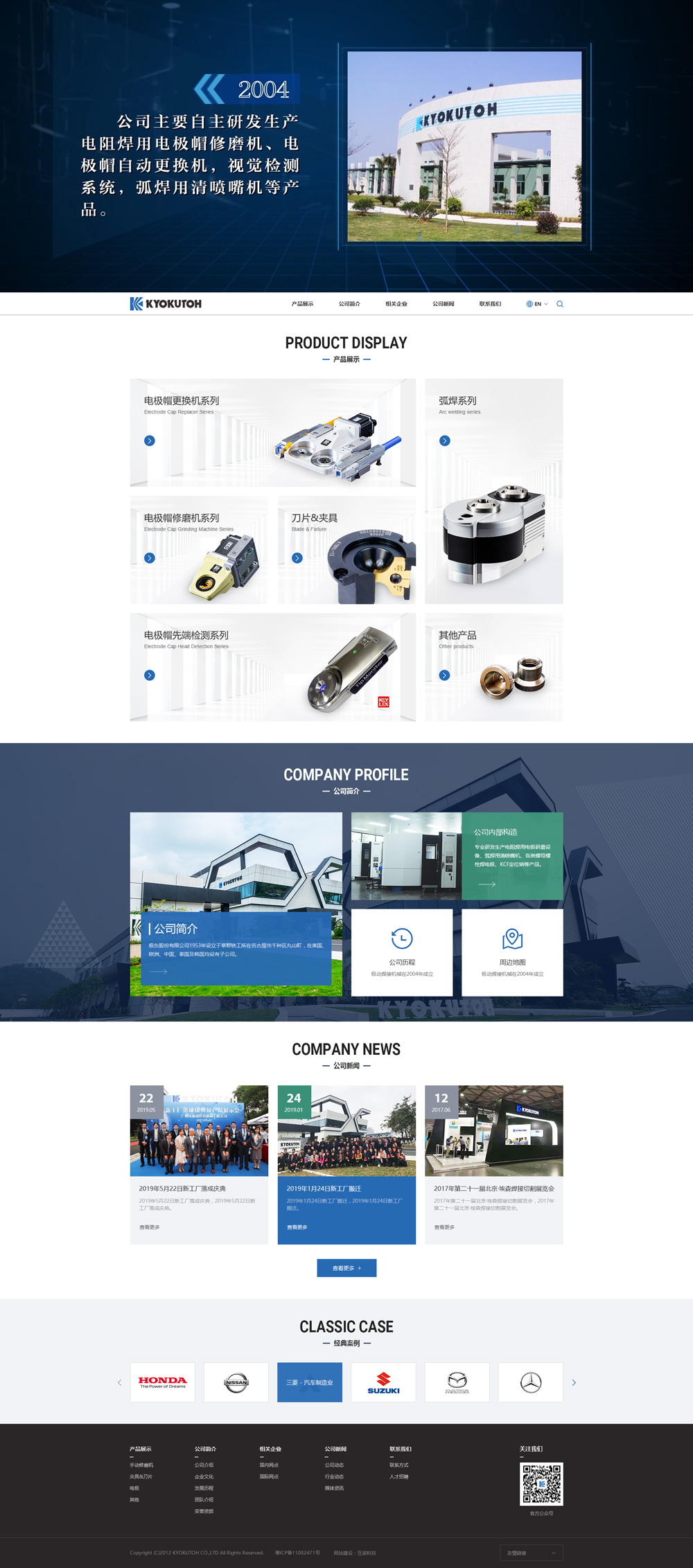 廣州市極動焊接機械有限公司是日本極東股份有限公司(KYOKUTOH CO.,LTD)在中國設立的分公司。成立于2004年,公司秉承日本極動70年的專業、專注精神,研發生產電阻焊用電極修磨設備、電極帽自動更換機,視覺檢測系統,弧焊用清噴嘴機等產品,廣泛應用于汽車制造及五金焊接行業。在國內外擁有大量汽車車身及零配廠應用實例,產品深受廣大客戶的好評。