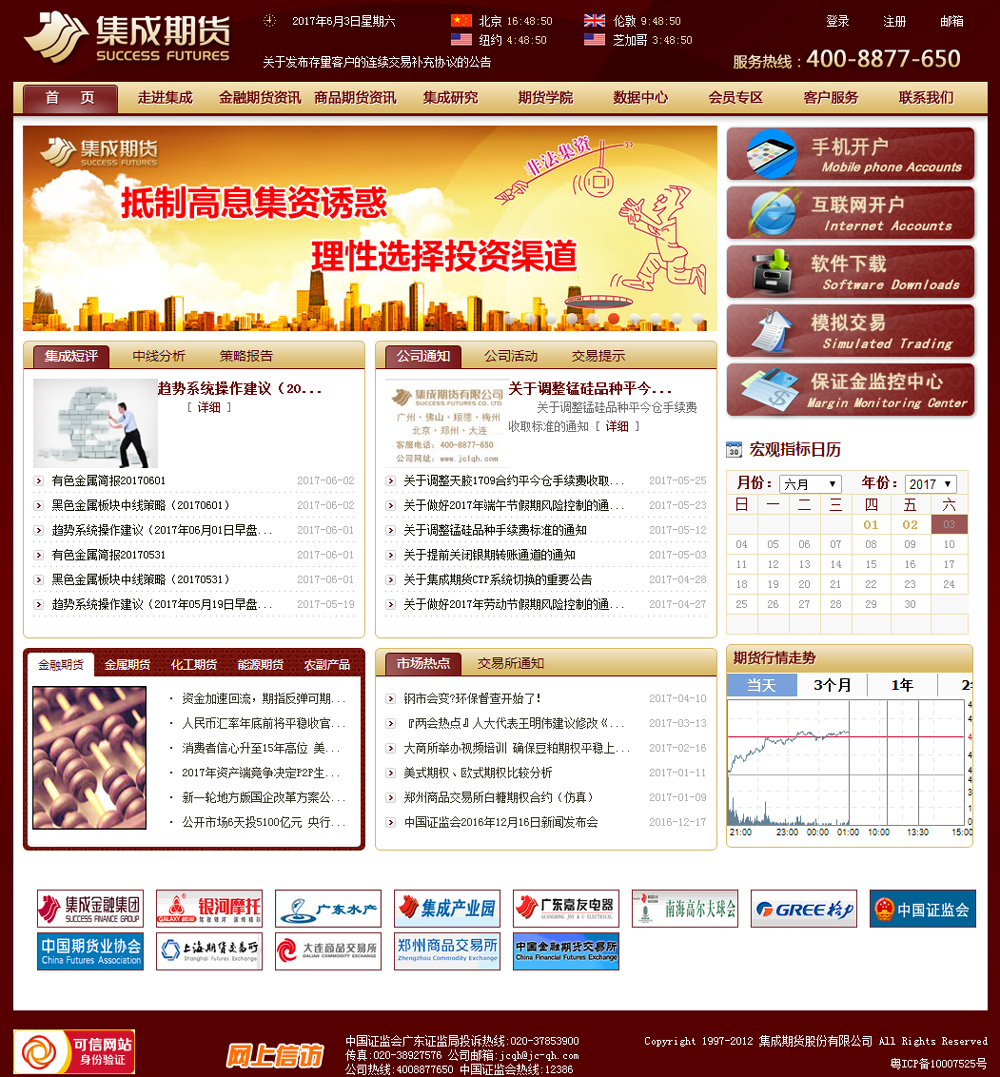 集成期貨有限公司是經(jīng)中國證監(jiān)會批準成立,在廣東省工商行政管理局正式登記注冊的專業(yè)期貨經(jīng)紀公司,注冊資金為人民幣5500萬元正,期貨紀經(jīng)業(yè)務許可證號為30280000,營業(yè)執(zhí)照注冊號為440000000023714。公司在上海期貨交易所的席位號為261,大連商品期貨交易所席位號為167,鄭州商品期貨交易所席位號為037,中國金融期貨交易所0246。公司主要從事國內(nèi)期貨經(jīng)紀、咨詢與培訓、企業(yè)套保策劃、代理實物交割服務等業(yè)務,可代理國內(nèi)商品期貨及金融期貨交易。 公司近幾年來成交額不斷放大,位居廣東省同行業(yè)前列。