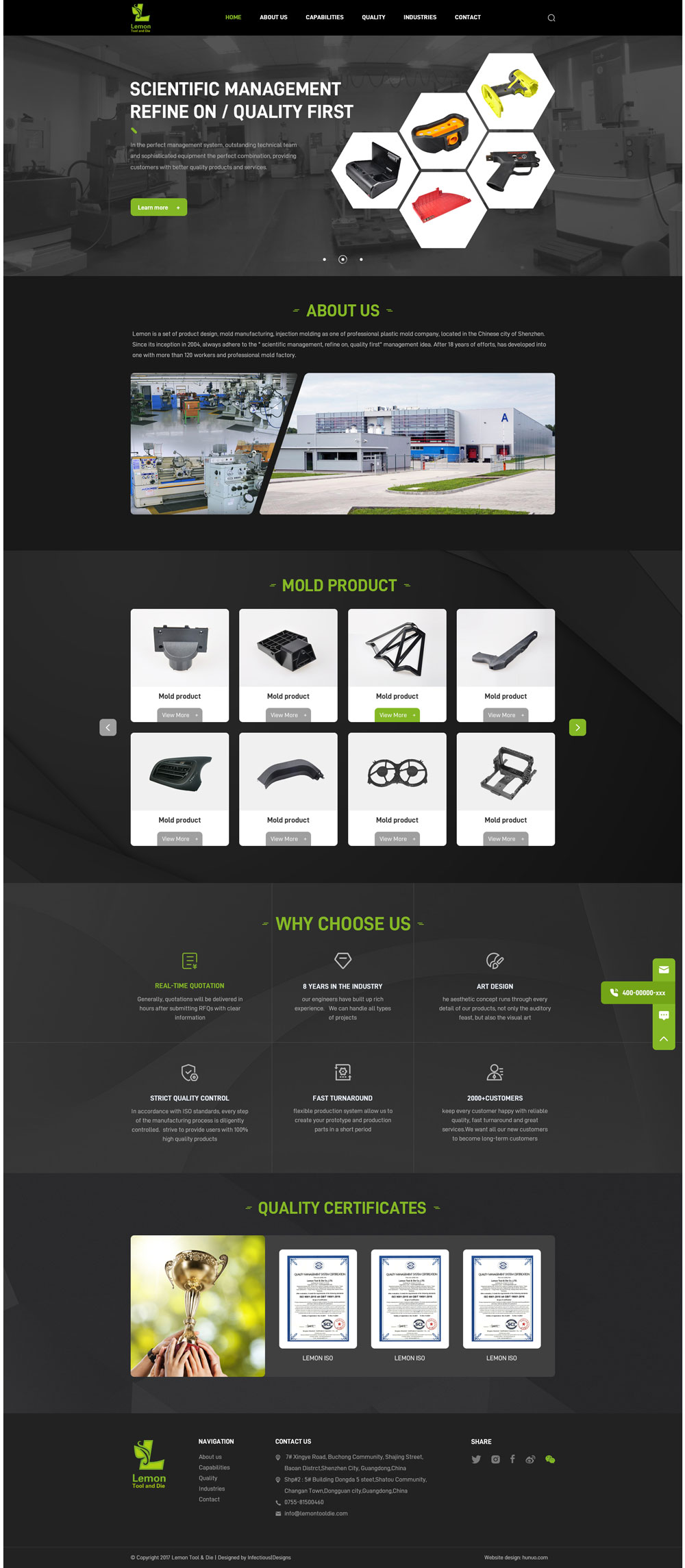 Lemon is a set of product design, mold manufacturing, injection molding as one of professional plastic mold company, located in the Chinese city of Shenzhen.Since its inception in 2004, always adhere to the " scientific management, refine on, quality first" management idea. After 18 years of efforts...