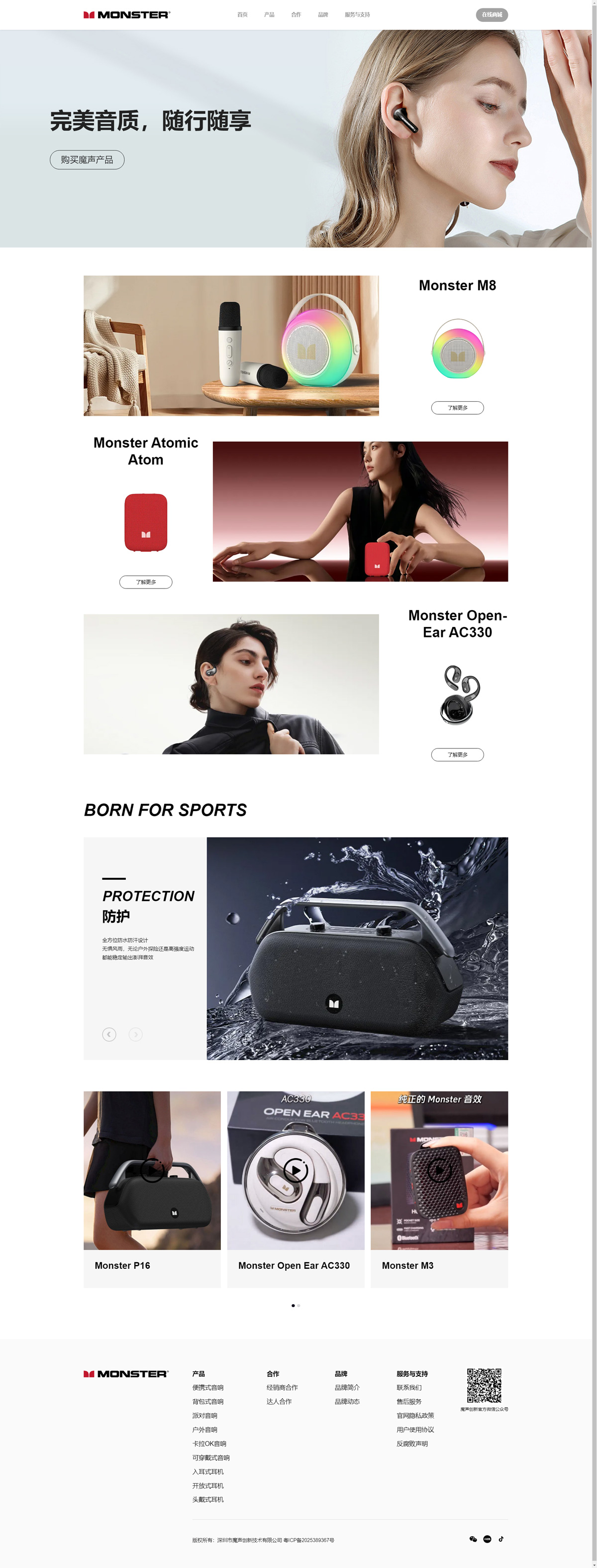 MONSTER是全球領先的高品質耳機制造商,為家庭娛樂、音頻、家庭影院、手機、電腦和游戲提供高級解決方案。魔聲公司由總裁李美圣(Noel Lee)于1979年創(chuàng)立,致力于打造更完美的音樂聲效的產品。在魔聲線材品牌的引領下,公司在高級音頻、視頻和數據連接性解決方案領域中引領潮流,在創(chuàng)新方面始終保持領先,申請了350多項美國及世界專利,還有100項正在研發(fā)過程中,并且在全球120多個國家銷售了6000多萬件產品。