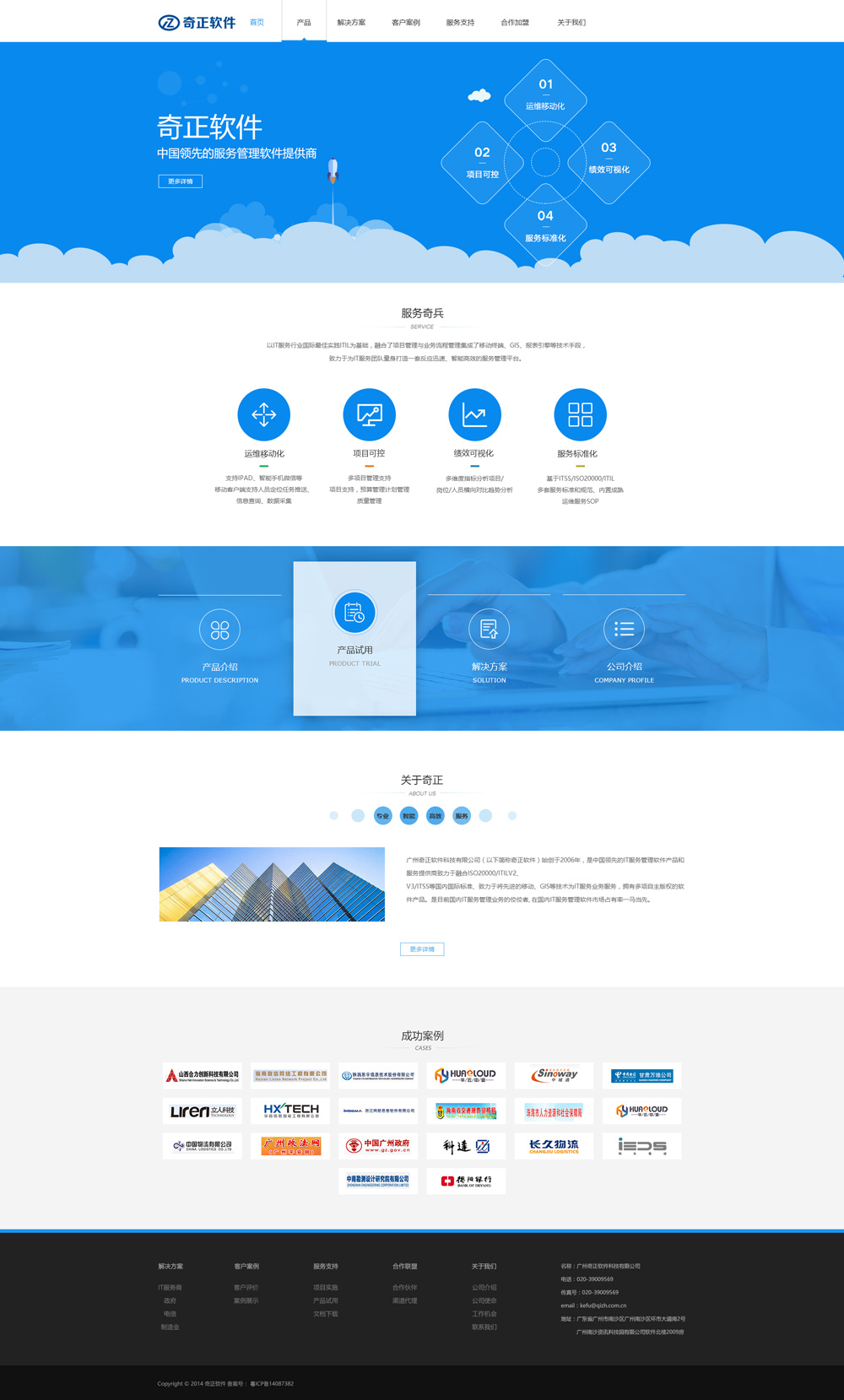 廣州奇正軟件科技有限公司(以下簡稱奇正軟件)始創于2006年,是中國領先的IT服務管理軟件產品和服務提供商,致力于融合ISO20000/ITILV2、V3/ITSS等國內國際標準、 致力于將先進的移動、GIS等技術為IT服務業務服務,擁有多項自主版權的軟件產品。是目前國內IT服務管理業務的佼佼者, 在國內IT服務管理軟件市場占有率一馬當先。