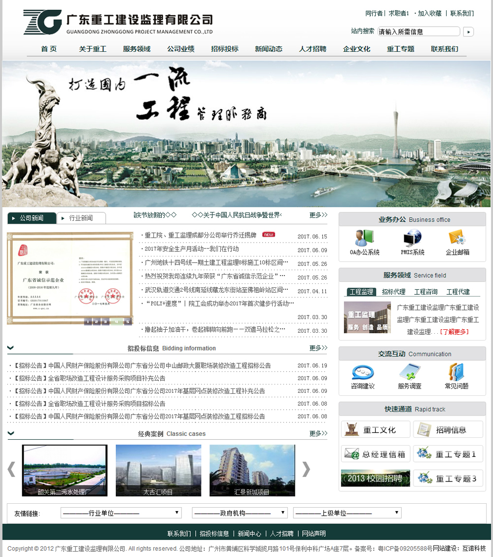 公司自成立以來,重工人艱苦奮斗、銳意進(jìn)取、以質(zhì)量求效益、以信譽(yù)求發(fā)展,創(chuàng)造了一個(gè)又一個(gè)工程奇跡,獲得一個(gè)又一個(gè)的嘉獎(jiǎng)證書。到目前為止,本公司承接的監(jiān)理項(xiàng)目四百多項(xiàng),總建筑面積七百多萬平方米,總造價(jià)三百多億元。其中,在近五年的獲獎(jiǎng)項(xiàng)目中,屬于國家級(jí)的獎(jiǎng)項(xiàng)有興豐生活垃圾衛(wèi)生填埋場工程獲國家優(yōu)質(zhì)工程金質(zhì)獎(jiǎng),凱旋新世界L4區(qū)工程獲國家優(yōu)質(zhì)工程銀質(zhì)獎(jiǎng),中海藍(lán)灣工程獲詹天佑大獎(jiǎng)優(yōu)秀住宅小區(qū)金獎(jiǎng)等,屬于廣東省、廣州市級(jí)別的獲獎(jiǎng)項(xiàng)目多達(dá)數(shù)十項(xiàng)。