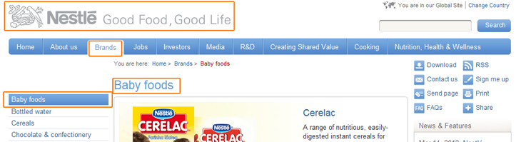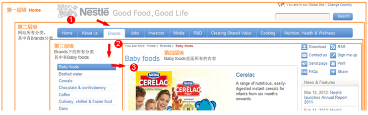 我們用導(dǎo)航原則來檢驗(yàn)nestle.com的導(dǎo)航設(shè)計(jì),這個(gè)頁面通過頁面標(biāo)題"baby foods"告訴我們當(dāng)前位置,通過網(wǎng)站logo,二級(jí)導(dǎo)航欄中選中的"Brands",左側(cè)三級(jí)導(dǎo)航欄選中的"Baby foods",告訴我們這個(gè)頁面的固定路徑是從home,選擇brands分類,再選擇Babyfoods。且導(dǎo)航欄的每一個(gè)分類都可以被點(diǎn)擊,可以讓用戶返回到上一級(jí)。這個(gè)頁面完成了導(dǎo)航所需要的所有信息傳達(dá)元素。我們也可以明顯地找到頁面中的: